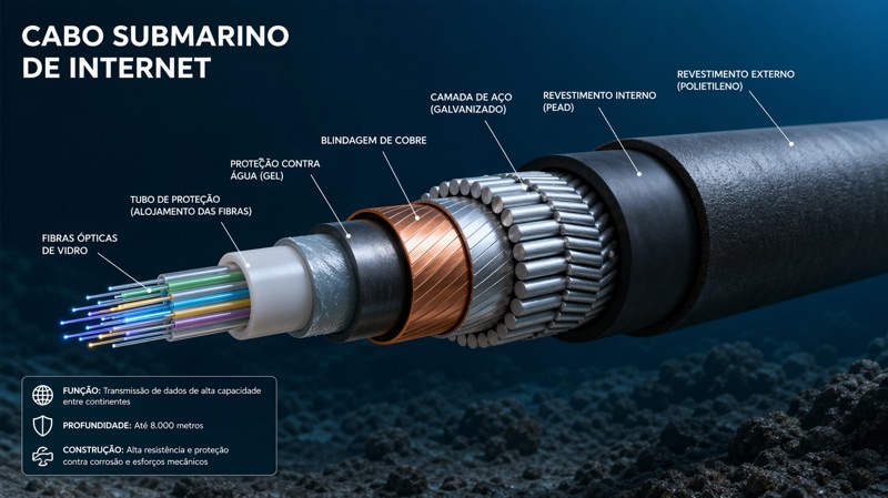 Embora a ideia de um cabo no fundo do mar possa evocar a imagem de algo robusto e espesso, a parte central de um cabo submarino de fibra óptica é surpreendentemente delicada. No entanto, ele é envolto por múltiplas camadas de proteção para resistir às condições extremas do ambiente marinho. A estrutura típica, de dentro para fora, inclui:
